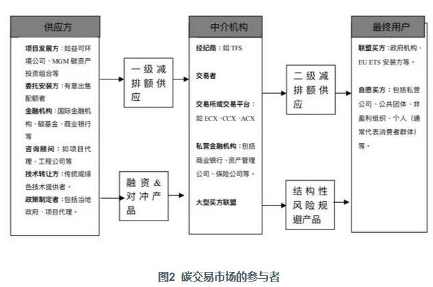 國際碳交易市場的參與者可以分為供給者、最終使用者和中介等三大類,涉及到受排放約束的企業(yè)或國家、減排項(xiàng)目的開發(fā)者、咨詢機(jī)構(gòu)以及金融機(jī)構(gòu)等。在碳交易市場中,金融機(jī)構(gòu)(包括商業(yè)銀行、資產(chǎn)管理者以及保險公司等)扮演著重要的角色,不僅為交易雙方提供間接或直接的融資支持,而且直接活躍于國際碳交易市場(見圖2)。