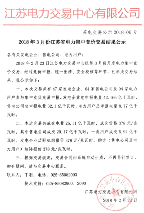 江蘇電力交易中心日前發(fā)布了2018年3月份江蘇省電力集中競(jìng)價(jià)交易結(jié)果公示,本次交易共有47家發(fā)電企業(yè)、64家售電公司及94家電力用戶參與集中