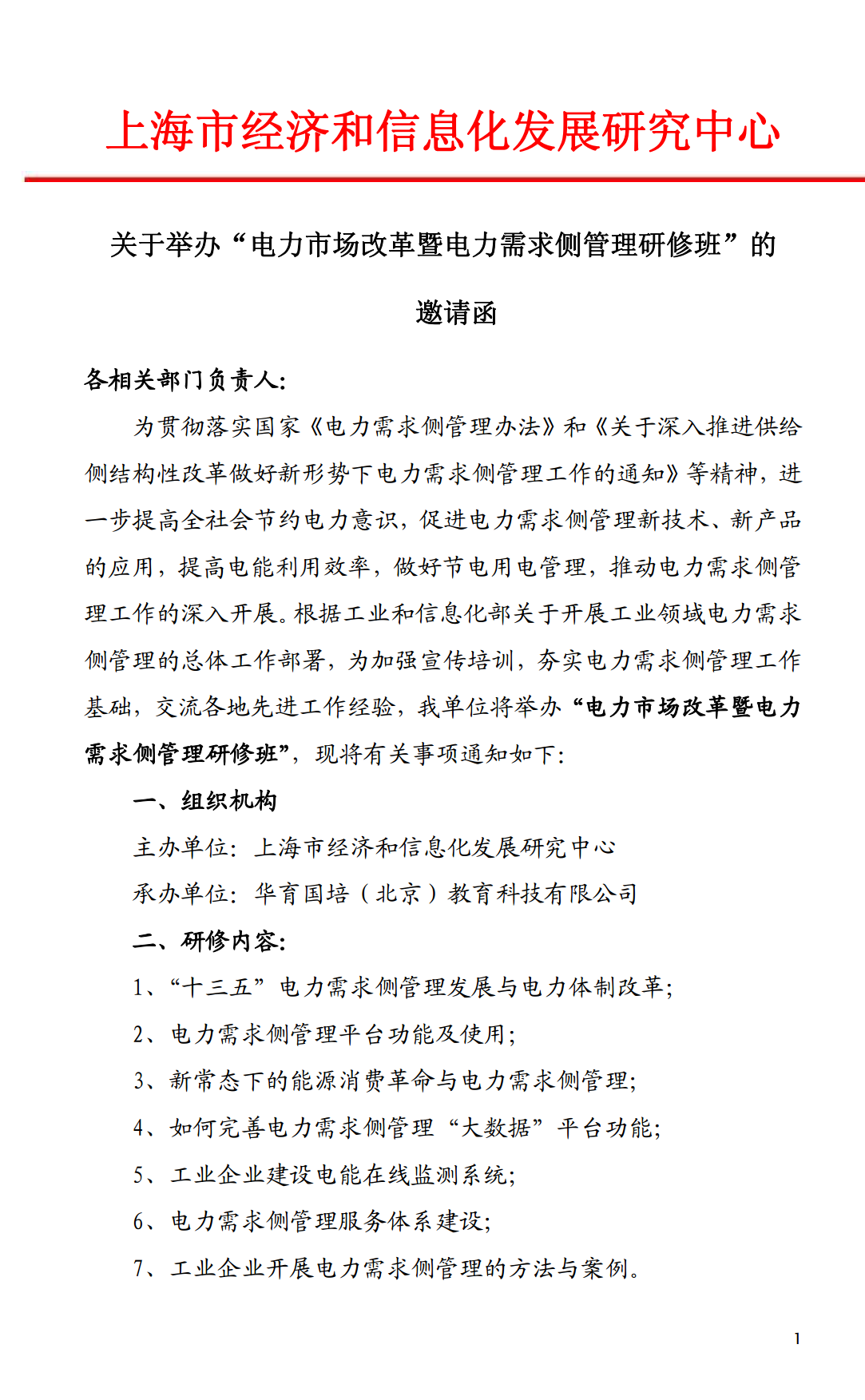 關(guān)于舉辦電力市場改革暨電力需求側(cè)管理研修班 的邀請函各相關(guān)部門負(fù)責(zé)人:為貫徹落實(shí)國家《電力需求側(cè)管理辦法》 和《關(guān)于深入推進(jìn)供給側(cè)