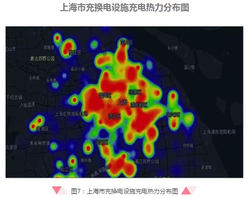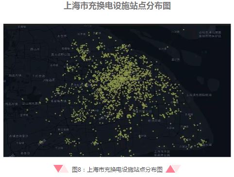 圖8為上海市充換電設(shè)施站點分布圖,全市分布的充電站點已超過5000個,從圖中可以看出全市充換電設(shè)施和全市充電量的行為發(fā)生一樣是集中在市區(qū),郊區(qū)充電站點則較為分散。全市充換電設(shè)施布局較為平均,基本實現(xiàn)了中心城區(qū)平均充電半徑3公里范圍。