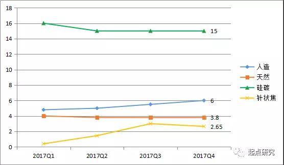 2017年各季度負(fù)極材料及針狀焦均價(jià)走勢(shì)分析(萬(wàn)元/噸)