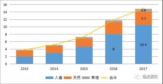 從各體系材料方面看,2017年總量增長(zhǎng)最大的為人造石墨,總體產(chǎn)量達(dá)10.4萬(wàn)噸,同比增長(zhǎng)30%,同時(shí)總體占比高達(dá)69.8%,其主要增長(zhǎng)帶動(dòng)因素有: