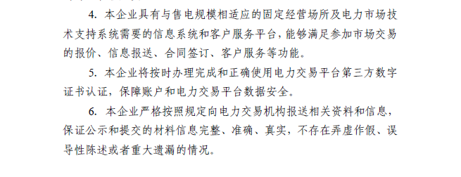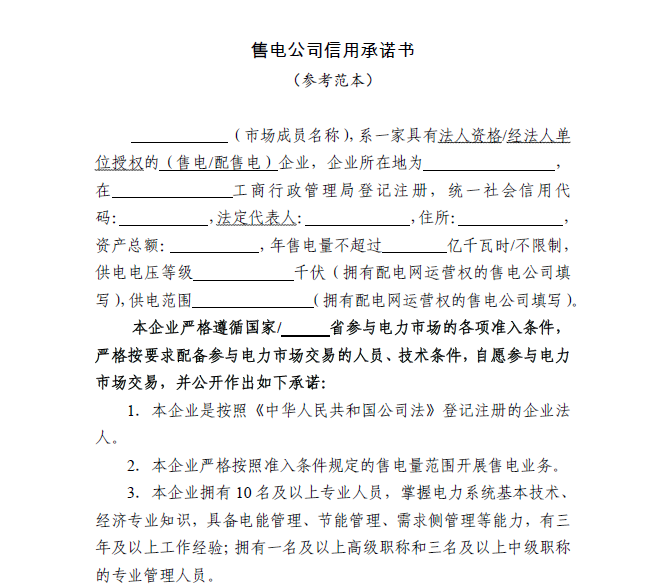 第九條 “一承諾”。售電公司辦理注冊(cè)時(shí),應(yīng)按固定格式簽署信用承諾書,并向電力交易機(jī)構(gòu)提交以下資料:營(yíng)業(yè)執(zhí)照、法人代表、資產(chǎn)證明、從業(yè)人員、經(jīng)營(yíng)場(chǎng)所和設(shè)備等基本信息和銀行賬戶、售電范圍等交易信息。擁有配電網(wǎng)運(yùn)營(yíng)權(quán)的售電公司還需提供配電網(wǎng)電壓等級(jí)、供電范圍、電力業(yè)務(wù)許可證(供電類)等相關(guān)資料。