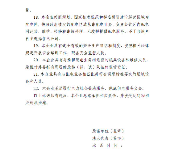 (八)承諾履行電力社會(huì)普遍服務(wù)、保底供電服務(wù)義務(wù)。