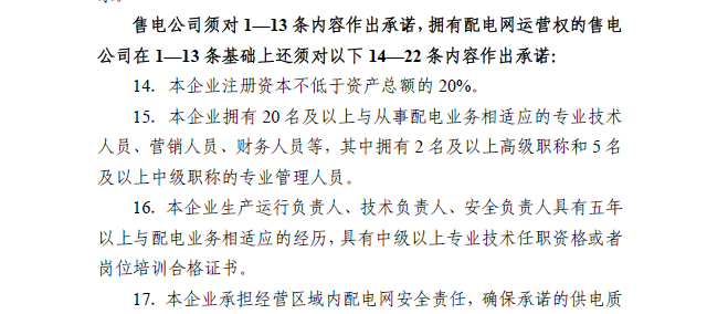 (一)擁有配電網(wǎng)運(yùn)營(yíng)權(quán)的售電公司的注冊(cè)資本不低于其總資產(chǎn)的20%。