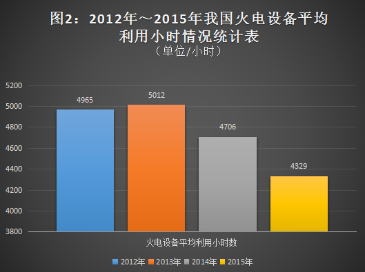 如圖2所示,除2013年為5012小時,同比去年略有增長之外,2012年、2014年、2015年的火電設(shè)備平均利用小時情況均呈下降狀態(tài),分別為4965小時、4706小時和4329小時。
