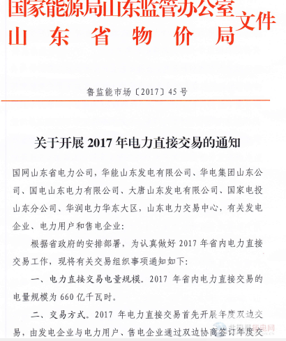 日前,國家能源局山東監(jiān)管辦公室、山東省物價(jià)局聯(lián)合發(fā)布了《關(guān)于開展2017年電力直接交易的通知》,2017年山東省內(nèi)電力直接交易的電量規(guī)模為660億千瓦時(shí),發(fā)電企業(yè)與電力用戶、售電企業(yè)可通過雙邊協(xié)商簽訂年度交易意向書。詳情如下: