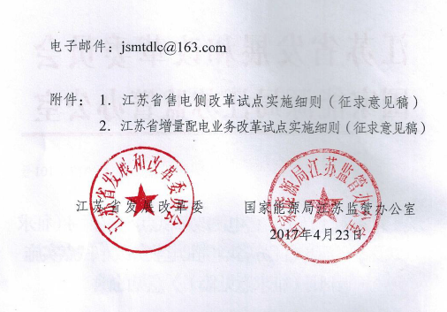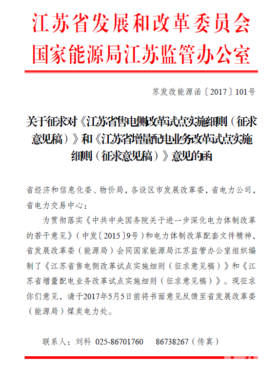 2017年4月23日,江蘇省發(fā)改委、國(guó)家能源局江蘇監(jiān)管辦發(fā)布關(guān)于征求對(duì)《江蘇省售電側(cè)改革試點(diǎn)實(shí)施細(xì)則(征求意見(jiàn)稿)》和《江蘇省增量配電業(yè)務(wù)改革試點(diǎn)實(shí)施細(xì)則(征求意見(jiàn)稿)》意見(jiàn)的函,這是繼今年3月份國(guó)家能源局、