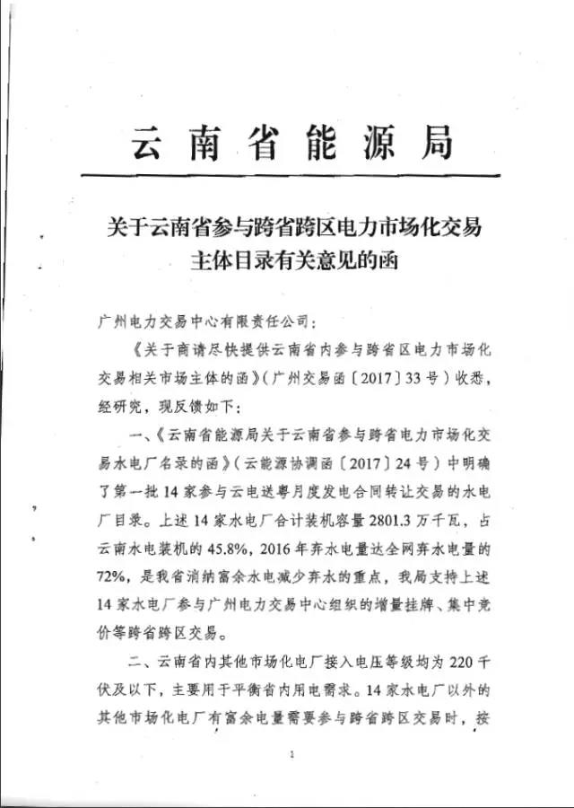 6月27日,云南能源局正式復(fù)函,同意14家水電廠參與廣州電力交易中心組織的增量掛牌、集中競價等跨省跨區(qū)交易。復(fù)函同時指出,希望廣州電力交易中心做好市場主體服務(wù),并與昆明電力交易中心做好銜接,云南能源局也將就交易情況進一步推動更多企業(yè)到廣州電力交易中心參與跨省(區(qū))交易。