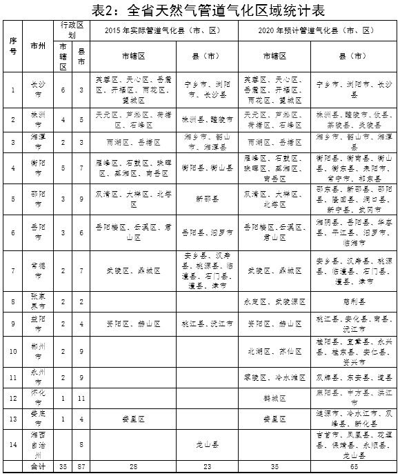 表2:全省天然氣管道氣化區(qū)域統(tǒng)計(jì)表