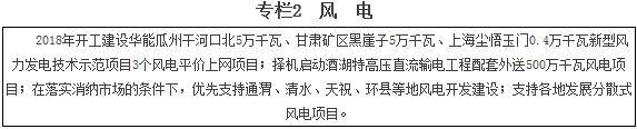(二)有序發(fā)展風(fēng)電。繼續(xù)組織全省風(fēng)能資源詳查,優(yōu)化風(fēng)電開發(fā)布局。堅(jiān)持集中式與分散式并舉,促進(jìn)風(fēng)電技術(shù)進(jìn)步和上網(wǎng)電價(jià)降低。加快風(fēng)電平價(jià)上網(wǎng)示范項(xiàng)目建設(shè)。2018年完成分散式風(fēng)電開發(fā)建設(shè)規(guī)劃。根據(jù)消納情況和國家政策,擇機(jī)啟動酒泉千萬千瓦級風(fēng)電基地二期電場項(xiàng)目。在落實(shí)就近消納市場情況下,在中東部風(fēng)能資源較為豐富、用電負(fù)荷較為集中、電網(wǎng)結(jié)構(gòu)相對較強(qiáng)的區(qū)域,適度建設(shè)集中式風(fēng)電場,優(yōu)先支持定西、慶陽等貧困地區(qū)、革命老區(qū)風(fēng)電開發(fā),有序推進(jìn)通渭、清水、天祝、環(huán)縣等地風(fēng)電場建設(shè)。到2020年,全省風(fēng)電裝機(jī)達(dá)到1400萬千瓦。