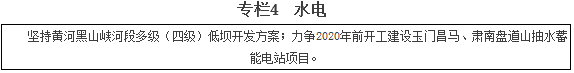 (四)規(guī)范水電開發(fā)。深入論證黃河黑山峽河段開發(fā)功能定位、庫區(qū)淹沒、移民和征地?fù)p失、社會穩(wěn)定性影響、生態(tài)影響等問題,堅(jiān)持推進(jìn)多級(四級)低壩開發(fā)方案。加快研究論證玉門、肅南抽水蓄能電站可行性,力爭早日啟動建設(shè)。以高度的政治責(zé)任感做好祁連山國家級自然保護(hù)區(qū)等水電站整改工作。加強(qiáng)水電資源開發(fā)的規(guī)劃管理和環(huán)境影響評價(jià),嚴(yán)格控制小水電開發(fā),在自然保護(hù)區(qū)、風(fēng)景名勝區(qū)等特殊生態(tài)功能區(qū)內(nèi)禁止新建水電項(xiàng)目,嚴(yán)格水電建設(shè)程序管理和運(yùn)行監(jiān)督,確保生態(tài)流量的下泄,保護(hù)河道生態(tài)環(huán)境。到2020年,全省水電裝機(jī)達(dá)到950萬千瓦左右。