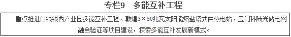 (九)推進(jìn)多能互補(bǔ)發(fā)展。在新建城鎮(zhèn)、產(chǎn)業(yè)園區(qū)、大型公用設(shè)施、商務(wù)區(qū)等新增用能區(qū)域,加強(qiáng)終端供能系統(tǒng)統(tǒng)籌規(guī)劃和一體化建設(shè)。優(yōu)化布局電力、燃?xì)?、熱力、供冷、供水管廊等基礎(chǔ)設(shè)施,通過天然氣熱電冷三聯(lián)供、分布式可再生能源和能源智能微網(wǎng)等方式實(shí)現(xiàn)多能互補(bǔ)和協(xié)同供應(yīng),建立配套電力調(diào)度、市場交易和價(jià)格機(jī)制,統(tǒng)籌推進(jìn)集中式和分布式儲能電站建設(shè),推進(jìn)儲能聚合、儲能共享等新興業(yè)態(tài),最大化利用儲能資源,充分發(fā)揮儲能的調(diào)峰、調(diào)頻和備用多類效益。2025年前在局部區(qū)域?qū)崿F(xiàn)風(fēng)光水火儲多能互補(bǔ)系統(tǒng)一體化運(yùn)行。爭取國家支持推進(jìn)白銀銀西產(chǎn)業(yè)園多能互補(bǔ)工程、敦煌3×50兆瓦太陽能熔鹽塔式供熱電站、玉門科陸光儲電網(wǎng)融合驗(yàn)證等項(xiàng)目建設(shè)。