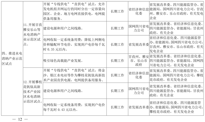 11.開(kāi)展甘孜雅安樂(lè)山等水電消納產(chǎn)業(yè)示范區(qū)試點(diǎn)。以“專(zhuān)線供電”方式降低上網(wǎng)側(cè)電價(jià)和輸配環(huán)節(jié)電價(jià),實(shí)現(xiàn)到戶(hù)電價(jià)每千瓦時(shí)0.35元以?xún)?nèi),吸引綠色高載能產(chǎn)業(yè)發(fā)展。