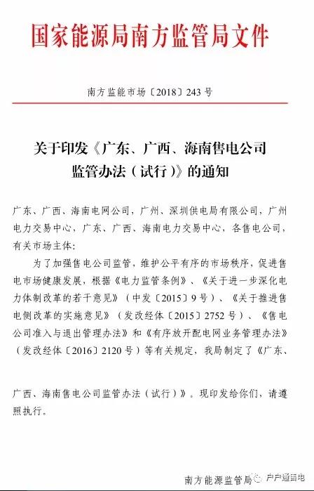 近日,南方能監(jiān)局印發(fā)《廣東、廣西、海南售電公司監(jiān)管辦法(試行)》的通知:
