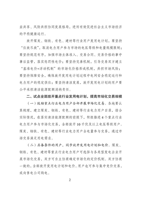 (一)在確保電網(wǎng)安全、妥善處理交叉補(bǔ)貼和公平承擔(dān)清潔能源配額的前提下,有序放開用戶電壓等級及用電量限制,符合條件的10千伏及以上電壓等級用戶均可參與交易。支持年用電量超過500萬千瓦時以上的用戶與發(fā)電企業(yè)開展電力直接交易。2018年放開煤炭、鋼鐵、有色、建材等4個行業(yè)電力用戶發(fā)用電計劃,全電量參與交易,并承擔(dān)清潔能源配額。