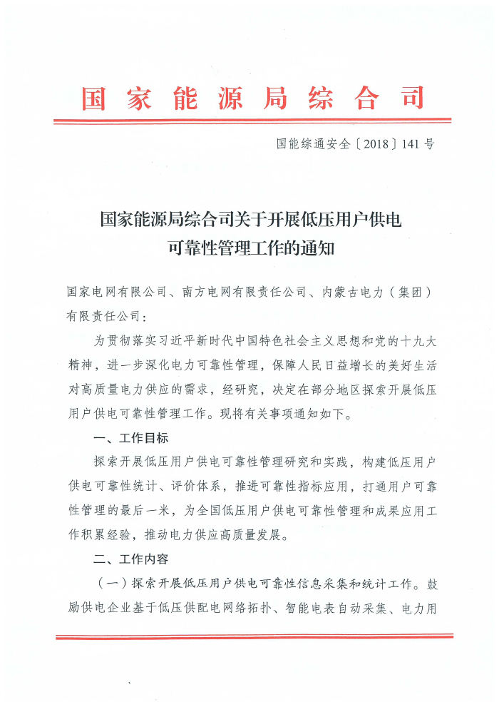 國家能源局綜合司發(fā)布《關于開展低壓用戶供電可靠性管理工作的通知》 國能綜通安全〔2018〕141號,具體內(nèi)容如下: