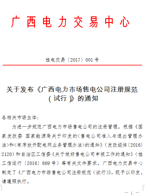 廣西電力交易中心日前發(fā)布了《廣西電力市場售電公司注冊規(guī)范(試行)》的通知,詳情如下:關(guān)于發(fā)布《廣西電力市場售電公司注冊規(guī)范(試行)》的通知各相關(guān)市場主體:為進(jìn)一步規(guī)范廣西電力市場售電公司的注冊管理,根據(jù)