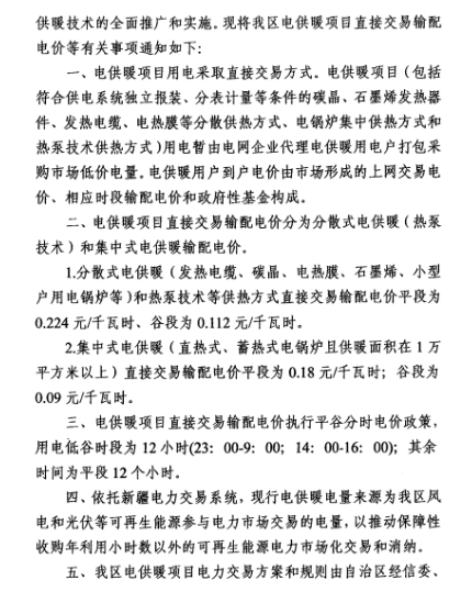 新疆自治區(qū)發(fā)改委、新疆自治區(qū)經(jīng)信委、國家能源局新疆監(jiān)管辦公室聯(lián)合發(fā)布了《關于我區(qū)電供暖項目直接交易輸配電價的通知》,通知中稱,電供暖項目用電采取直接交易方式,電供暖項目直接交易輸配電價分為分散式電供暖和集中式電供暖輸配電價,其中分散式電供暖和熱泵技術等供熱方式,直接交易輸配電價是平段0.224元/千瓦時、谷段0.112元/千瓦時;集中式電供暖直接交易輸配電價是平段0.18元/千瓦時、谷段0.09元/千瓦時。電供暖項目直接交易輸配電價執(zhí)行平谷分時電價政策,用電低谷時段為12小時(23時到次日9時,14時到16時),其余時間為平段12小時。