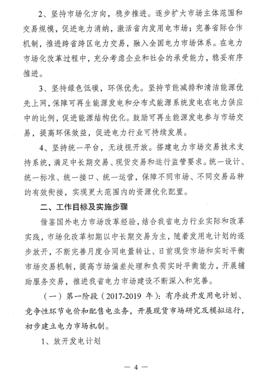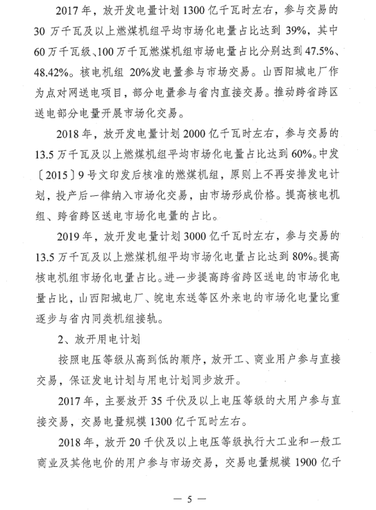 第一階段(2017年-2019年):有序放開發(fā)用電計劃、競爭性環(huán)節(jié)電價和配售電業(yè)務,開展現(xiàn)貨市場研究及模擬運行,初步建立電力市場機制。2018年放開發(fā)電量計劃2000億千瓦時左右,參與交易的13.5萬千瓦以及上燃煤機組平均市場化電量占比達到60%。2019年,放開發(fā)電量計劃3000億千瓦時左右,參與交易的13.5萬千瓦及以上燃煤機組平均市場化電量占比達到80%。
