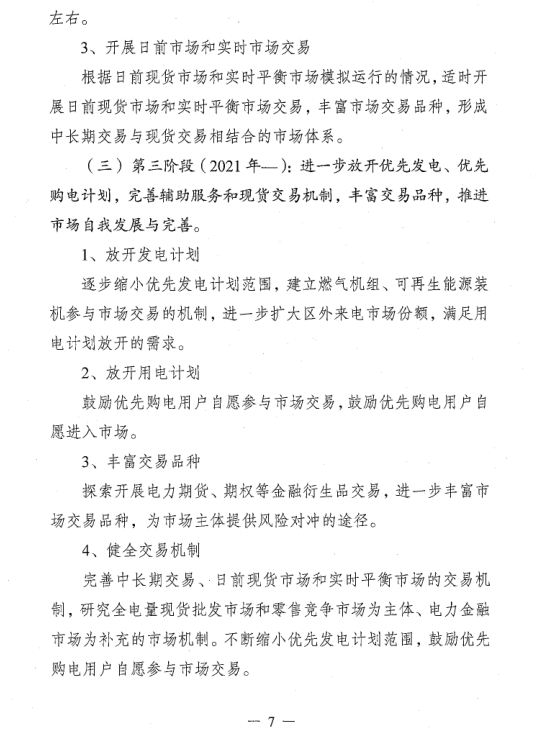 第三階段(2021年-):進一步放開優(yōu)先發(fā)電、優(yōu)先購電計劃,完善輔助服務和現(xiàn)貨交易機制,豐富交易品種,推進市場自我發(fā)展與完善。