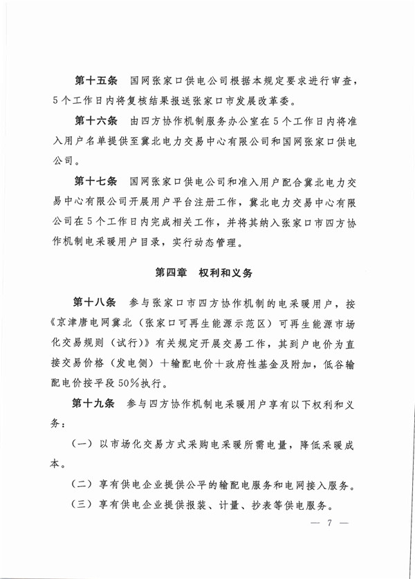 關于印發(fā)《張家口市參與四方協(xié)作機制電采暖用戶準入與退出管理規(guī)定(試行)》、