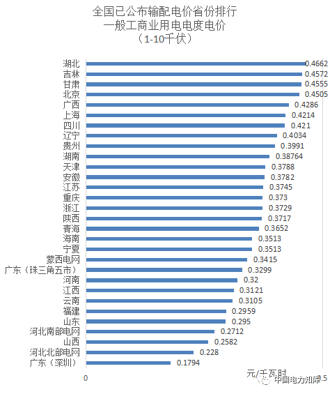 2、1-10千伏電壓等級下,湖北最高為0.4662元/千瓦時,廣東深圳最低為0.1794元/千瓦時。