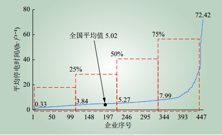 2017 年,通過對全國 448 個地市級供電企業(yè)的用戶平均停電時間指標(biāo)進行分析,各企業(yè)的指標(biāo)差異較為明顯。將地市級供電企業(yè)的指標(biāo)分為4 個梯隊,處于第一梯隊(即 25%)的用戶平均停電時間低于 10.76 h/戶,城市用戶平均停電時間低于 3.84 h/戶,農(nóng)村用戶平均停電時間低于 14.79 h/戶。