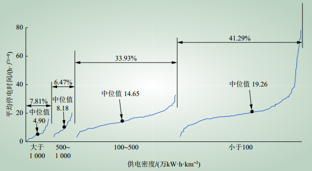 圖 9 2017 年地市級供電企業(yè)用戶平均停電時間按供電密度分布情況