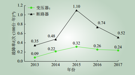圖 12 2013—2017 年變壓器、斷路器故障率變化情況