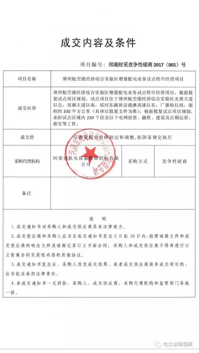 祝 賀鄭州航空港增量配電試點項目業(yè)主正式確定!鄭州航空港興港電力有限公司成功中選!該項目將采用特許經(jīng)營模式,經(jīng)營期限30年,期滿移交政府。興港電力的股權(quán)結(jié)構(gòu):鄭州航空港區(qū)國有資產(chǎn)經(jīng)營管理有限公司持股51