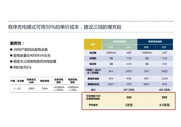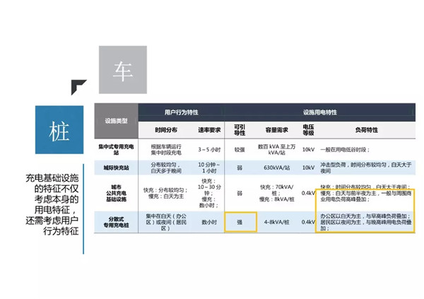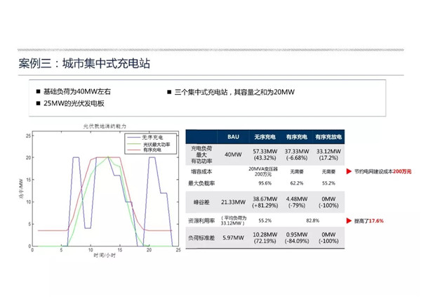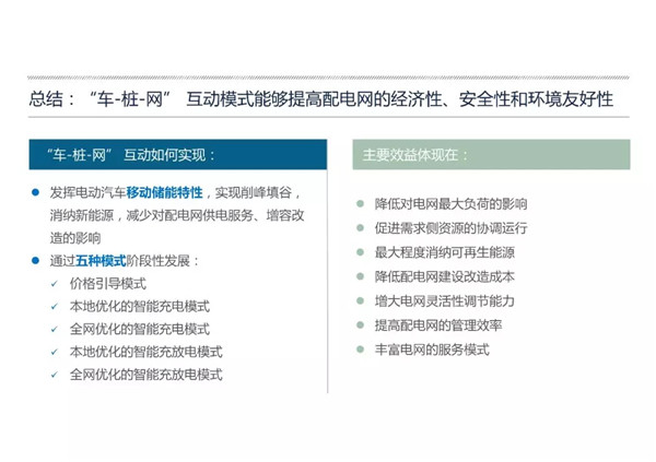 報告對比分析了電動汽車無序充電行為和“車-樁-網(wǎng)”互動對配電網(wǎng)運行的影響,著重分析了有序充電對電網(wǎng)的影響。 “車-樁-網(wǎng)”互動可以顯著降低對電網(wǎng)最大負荷的影響,促進需求側(cè)資源的協(xié)調(diào)運行,最大程度消納新能源,并降低配電網(wǎng)建設改造成本。以一個2000戶的居民區(qū)配電設施為例,在配置充電樁時,無序充電下小區(qū)用電總?cè)萘恳黾?05%,在有序用電模式下用電下僅增加35%,并減少充電樁成本約50%。“車-樁-網(wǎng)”互動增強電網(wǎng)靈活性調(diào)節(jié)能力。電動汽車的停駛特性與電網(wǎng)負荷的爬坡特性存在較好的匹配關(guān)系。當早晨電網(wǎng)負荷爬升以及夜間電網(wǎng)負荷快速降低的同時,電動汽車也進入停駛狀態(tài),可以通過充電基礎(chǔ)設施接入電網(wǎng),參與電網(wǎng)的削峰填谷。“車-樁-網(wǎng)”互動模式還能夠提高配電網(wǎng)的管理效率,豐富電網(wǎng)的服務模式。