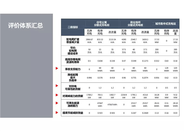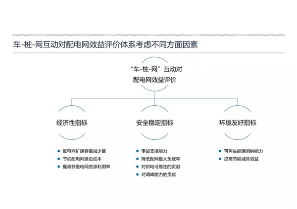 報告建立了“車-樁-網(wǎng)”互動對配電網(wǎng)綜合效益影響的評價體系。以一個2000戶的居民區(qū)配電設施為例,在“車-樁-網(wǎng)”互動模式下,配電網(wǎng)擴建容量減少約78%,配電網(wǎng)的資源利用率可提高約34%,負載率可降低約42%,并提升事故支撐能力,即配電網(wǎng)發(fā)生故障時能夠調(diào)用的用戶資源支撐配電網(wǎng)恢復供電行為的能力。有序充電模式下,節(jié)約電網(wǎng)建設成本約35萬元,外部電網(wǎng)發(fā)生故障的時候,電動汽車作為電源向小區(qū)其他負荷供電,能夠保證小區(qū)不停電。有序充電模式可以提高可再生能源消納能力,增加電網(wǎng)節(jié)能減排效益約50%。