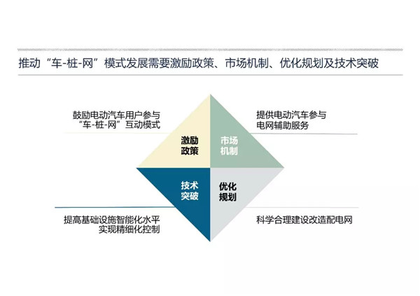 報告將 “車-樁-網(wǎng)”互動方式分為價格引導模式、本地優(yōu)化的智能充電模式、全網(wǎng)優(yōu)化的智能充電模式、本地優(yōu)化的智能充放電模式、全網(wǎng)優(yōu)化的智能充放電模式共五種互動模式。報告指出,在廣泛應用價格引導模式的基礎(chǔ)上,本地優(yōu)化的智能充電模式有望率先得到應用,一方面有利于降低局部配電網(wǎng)的建設改造成本,另一方面能夠在技術(shù)、設備、標準等方面打下良好基礎(chǔ);下一階段隨著電池成本下降、壽命提升與梯次利用的推廣,大電網(wǎng)需求響應、電力市場等配套條件逐漸成熟,本地與全網(wǎng)優(yōu)化的智能充放電模式有望實現(xiàn)應用。