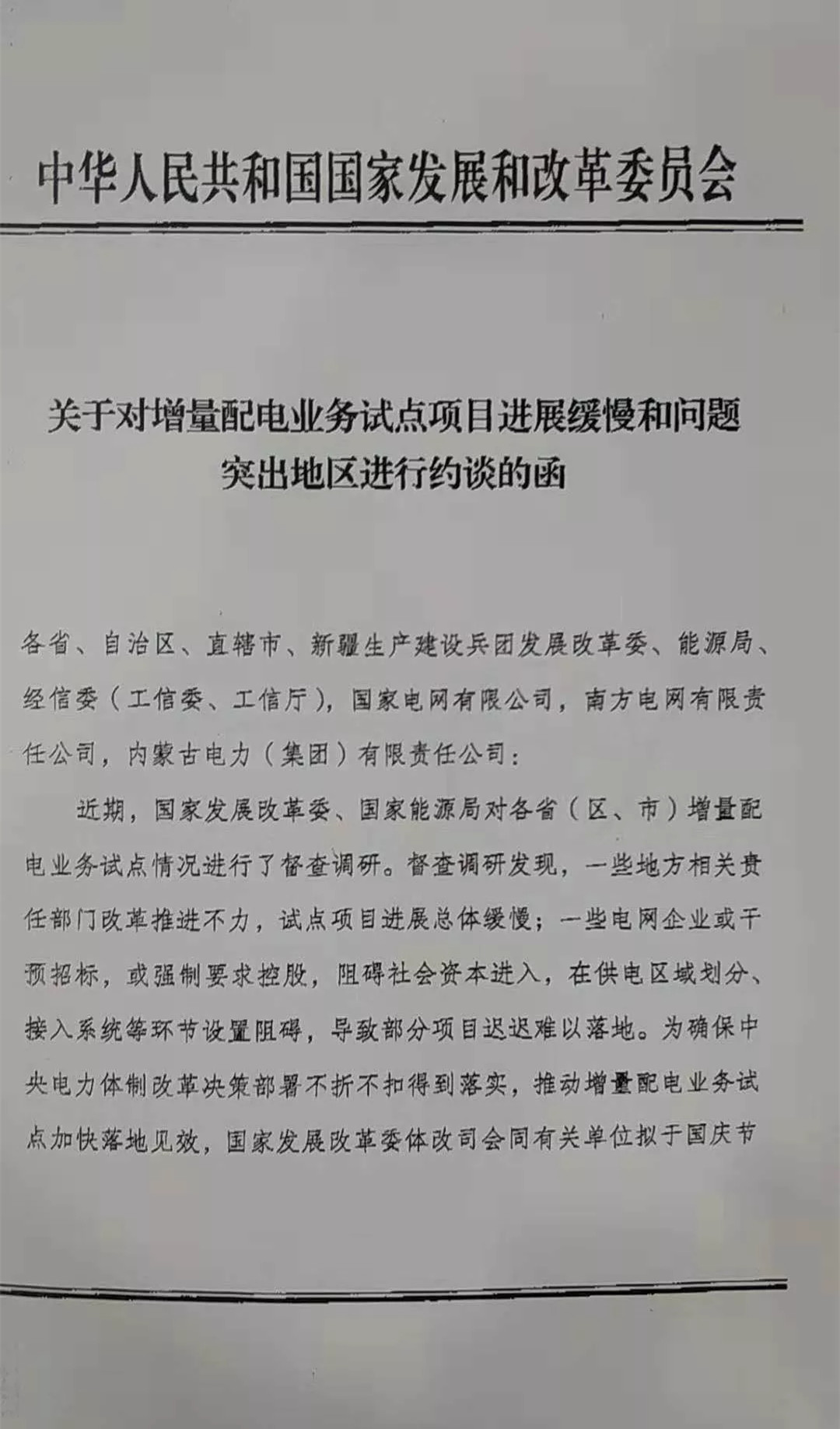 國家發(fā)改委9月28日發(fā)布了《關(guān)于對增量配電業(yè)務(wù)試點項目進(jìn)展緩慢和問題突出地區(qū)進(jìn)行約談的函》,將于國慶節(jié)后對增量配網(wǎng)試點改革進(jìn)展緩慢、問題突出地區(qū)進(jìn)行約談。