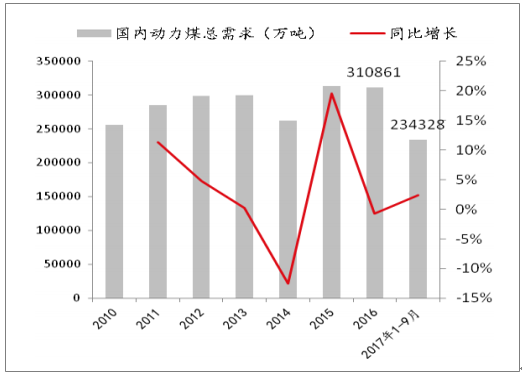 2017年我國動力煤價(jià)格維持高位運(yùn)行,煤炭供給側(cè)改革成效顯著,動力煤市場維持緊平衡狀態(tài)。2017年1-9月,我國動力煤總需求23.43億噸,同比增長2.39%。其中,電力行業(yè)消費(fèi)量14.07億噸,占比60%,同比下降0.02%;建材行業(yè)2.3億噸,占比10%,同比下降37.89%;冶金行業(yè)消費(fèi)量1.1億噸,占比5%,同比增長3.27%;化工行業(yè)消費(fèi)量1.3億噸,占比5%,同比下降17.36%;供熱行業(yè)消費(fèi)量1.6億噸,占比7%,同比增長7.84%;其他行業(yè)消費(fèi)量3億噸,占比13%,同比增長223.64%。2016年的動力煤消費(fèi)量約為31億噸,其中電力行業(yè)消費(fèi)動力煤19.1億噸,占比約為62%、建材行業(yè)消費(fèi)動力煤5億噸,占比16%、兩者占比合計(jì)為78%,其余包括供熱、冶金、化工以及其他行業(yè)動力煤消費(fèi)量合計(jì)占比約為22%左右。