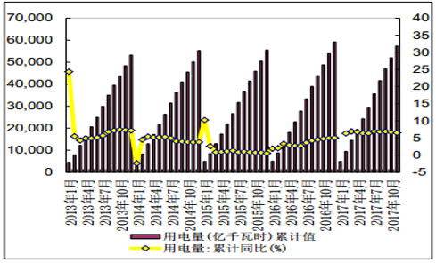 2017年1-11 月份,全國全社會用電量 57331 億千瓦時,同比增長 6.5%,增速比上年同期提高 1.5 個百分點。1-11 月份,第一產(chǎn)業(yè)用電量 1074 億千瓦時,同比增長 7.1%,占全社會用電量的比重為 1.9%;第二產(chǎn)業(yè)用電量 40185 億千瓦時,同比增長 5.5%,增速比上年同期提高 2.9 個百分點,占全社會用電量的比重為 70.1%,對全社會用電量增長的貢獻率為 59.8%;第三產(chǎn)業(yè)用電量 8054 億千瓦時,同比增長 10.5%,增速比上年同期回落1.1 個百分點,占全社會用電量的比重為 14.0%,對全社會用電量增長的貢獻率為 21.9%;城鄉(xiāng)居民生活用電量 8018 億千瓦時,同比增長 7.7%,增速比上年同期回落 3.8 個百分點,占全社會用電量的比重為 14.0%,對全社會用電量增長的貢獻率為 16.3%。