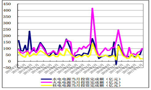 2017年1-11 月份,全國主要發(fā)電企業(yè)電源工程完成投資 2329 億元,同比下降 13.4%。其中,水電 492 億元,同比增長 2.1%;火電 674億元,同比下降 27.4%;核電 336 億元,同比下降 12.9%;風電 576億元,同比下降 16.0%。水電、核電、風電等清潔能源完成投資占電源完成投資的 71.1%,比上年同期提高 5.6 個百分點。2017年1-11 月份,全國電網(wǎng)工程完成投資 4662 億元,同比下降 2.2%。