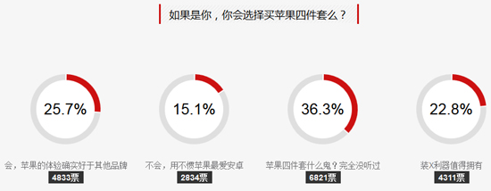 如今在蘋果Apple watch發(fā)布上市之后,傳統(tǒng)蘋果三件套要升級(jí)為全新四件套了。蘋果的數(shù)碼產(chǎn)品牌子響亮,體驗(yàn)好有逼格,自然是吸引很多學(xué)生用戶去追捧攀比,而在我們的調(diào)查中累積也有48.5%的用戶表示會(huì)購(gòu)買,認(rèn)為是裝X利器。但是如今要想擁有這樣的蘋果四件套至少也得上萬(wàn)元,這對(duì)不少工薪家庭來(lái)說還是一筆不小的開支,這也難怪成為不少父母難以承受的痛,在我們調(diào)查中就有36.3%的用戶表示完全不關(guān)注蘋果四件套。