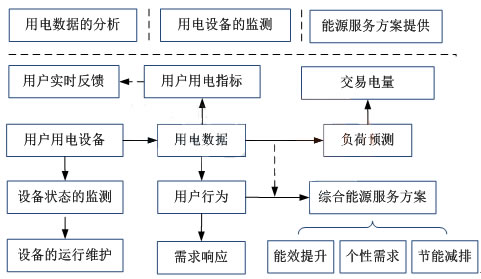 用電設備的監(jiān)測強調(diào)對用戶數(shù)據(jù)指標的采集和電力設備狀態(tài)的監(jiān)測,逐步實現(xiàn)對用戶用電狀態(tài)和設備運行狀態(tài)的分析管理,進而幫助進行用戶用電狀態(tài)的實時反饋和電力設備的運行維護。能源服務方案的提供則側(cè)重于通過為用戶提供綜合能源服務解決方案,幫助用戶提高自身能效并滿足其個性化的用能需求,逐步實現(xiàn)用戶的節(jié)能減排目標。其具體情況如圖1-1所示: