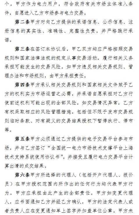 從上海電力交易中心獲悉,上海電力交易中心日前發(fā)布了關(guān)于電力用戶入市協(xié)議。協(xié)議共計(jì)十四條內(nèi)容,為了市場主體順利開展各項(xiàng)交易業(yè)務(wù),交易雙方根據(jù)交易規(guī)則及相關(guān)管理辦法,遵循平等、自愿、公平和誠信的原則,簽訂如下協(xié)議: