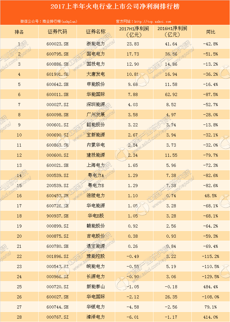 原標(biāo)題:2017上半年火電行業(yè)上市公司凈利潤(rùn)排行榜:浙能電力排名第一,國(guó)電電力/國(guó)投電力分列二三