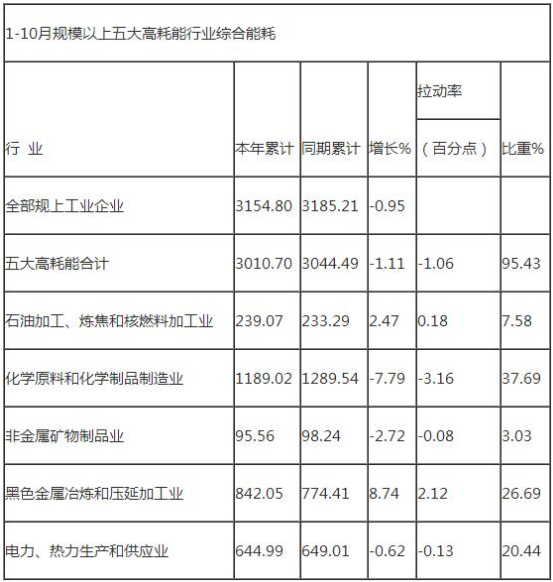 此外,1-10月,全市五大高耗能行業(yè)能耗3010.70萬噸標(biāo)準(zhǔn)煤,占比達(dá)95.43%,同比下降1.11%。五大高耗能行業(yè)“兩升三降”。