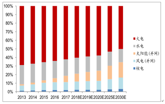 2013-2030年我國(guó)各類型電源發(fā)電量占比統(tǒng)計(jì)與預(yù)測(cè)