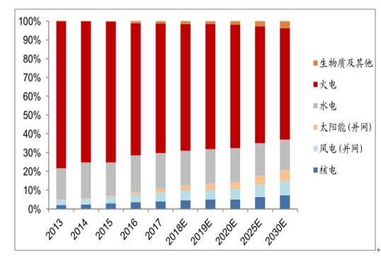 近年來(lái),非化石能源發(fā)電裝機(jī)有望在國(guó)內(nèi)電源裝機(jī)結(jié)構(gòu)中持續(xù)提升??紤]我國(guó)資源稟賦情況及長(zhǎng)期能源安全,非化石能源利用將是國(guó)內(nèi)能源結(jié)構(gòu)轉(zhuǎn)型的的必由之路,而非化石能源的有效利用將更多依賴向電能的轉(zhuǎn)化,因此國(guó)內(nèi)非化石能源在發(fā)電裝機(jī)占比和發(fā)電量占比方面,將在“十三五”期間持續(xù)提升。結(jié)合非化石能源利用方式來(lái)看,清潔能源發(fā)電裝機(jī)持續(xù)增長(zhǎng)預(yù)期,最值得關(guān)注。展望2030年,預(yù)計(jì)我國(guó)發(fā)電總裝機(jī)將超過(guò)2,800GW,火電的占比將自 2017年的62%降至 50%,非水清潔能源(風(fēng)、光、核)的合計(jì)占比將自2017年的18.6%升至34.4%;屆時(shí)全國(guó)年用電總量將達(dá)到9.3萬(wàn)億度,核電、風(fēng)電、太陽(yáng)能發(fā)電的占比將分別達(dá)到 7.35%、7.37%、5.81%。