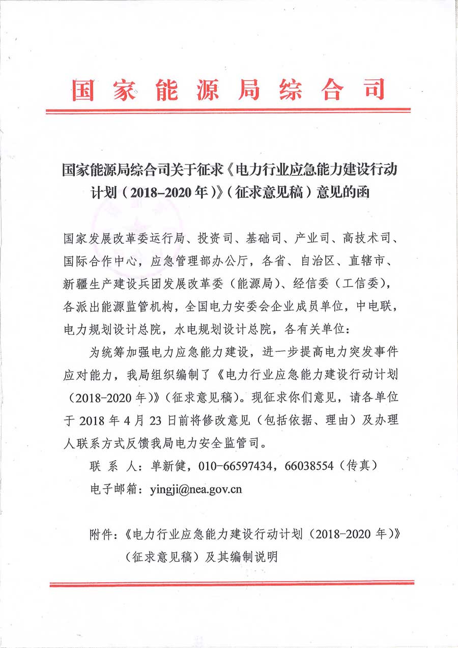 國家能源局綜合司關(guān)于征求《電力行業(yè)應(yīng)急能力建設(shè)行動計劃(2018-2020年)》(征求意見稿)意見的函,內(nèi)容如下: