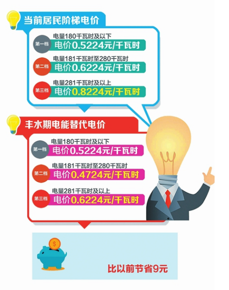 據(jù)了解,2018年豐水期居民生活電能替代價格政策執(zhí)行方式與2017年一致, 即在維持現(xiàn)行階梯電價制度不變的基礎(chǔ)上, 對豐水期城鄉(xiāng)“一戶一表”居民用戶月用電量在181千瓦時至280千瓦時部分的電價下移0.15元/千瓦時,月用電量高于280千瓦時部分的電價下移0.2元/千瓦時, 現(xiàn)行低谷時段電價、城鄉(xiāng)“低保戶”和農(nóng)村“五保戶”免費用電基數(shù)等政策保持不變。