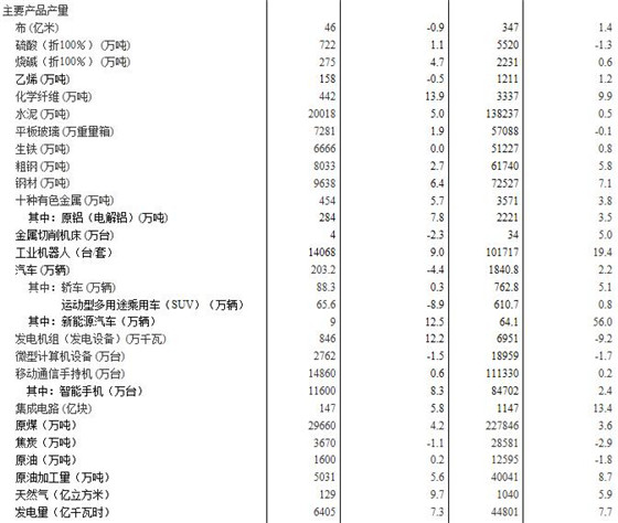 分產(chǎn)品看,8月份,596種產(chǎn)品中有336種產(chǎn)品同比增長(zhǎng)。其中,鋼材9638萬(wàn)噸,同比增長(zhǎng)6.4%;水泥20018萬(wàn)噸,增長(zhǎng)5.0%;十種有色金屬454萬(wàn)噸,增長(zhǎng)5.7%;乙烯158萬(wàn)噸,下降0.5%;汽車203.2萬(wàn)輛,下降4.4%;轎車88.3萬(wàn)輛,增長(zhǎng)0.3%;發(fā)電量6405億千瓦時(shí),增長(zhǎng)7.3%;原油加工量5031萬(wàn)噸,增長(zhǎng)5.6%。