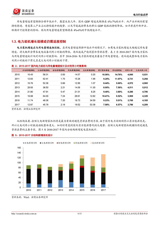 中長(zhǎng)期來(lái)看,用電量增速與名義 GDP 增速存在較強(qiáng)的相關(guān)性,如果同時(shí)考慮國(guó)內(nèi)經(jīng)濟(jì)結(jié)構(gòu)轉(zhuǎn)型以及節(jié)能減排的持續(xù)推動(dòng),單位 GDP 能耗與電耗均有望保持平穩(wěn)下行。據(jù)此,我們預(yù)計(jì),國(guó)內(nèi)用電量增速有望維持在 4-6%的中低速水平,基于此電力裝機(jī)總規(guī)模仍需適度控制。