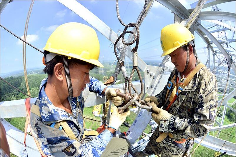 江蘇省送變電公司人員在±800千伏晉蘇線直流特高壓N3434鐵塔上緊固導(dǎo)線,全力投入國(guó)家大氣污染防治工程建設(shè)。